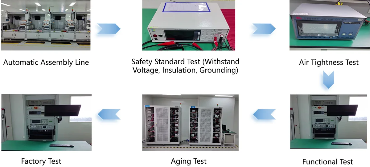 Produktuak EBko CE ziurtagiria, AEBetako FCC ziurtagiria, Txinako CCC ziurtagiria eta CB ziurtagiria gainditu ditu, IEC 62368-1 segurtasun-arauak eta RoHS ingurumen-baldintzak betetzen ditu, prozesu osoko kalitate-kontrolarekin lehengaietatik amaitutako produktuetaraino. Fabrikak produkzio lerro estandarizatuak eta proba profesionalen laborategiak ditu. Produktu bakoitzak 72 orduko etengabeko zahartze-proba, tentsio-erresistentzia-proba, tenperatura altuko eta baxuko ingurune-probak egiten ditu fabrikatik irten aurretik, errendimendu egonkorra bermatzeko. Eman produktuen kualifikazio-ziurtagiriak eta proba-txostenak, bezeroek tokian tokiko fabrikako ikuskapena eta kalitate-kontrola lagintzen lagunduz.