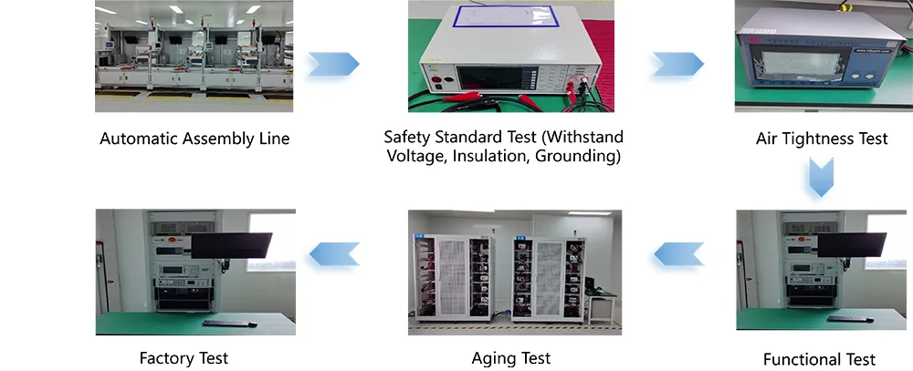 Produktuak ziurtagiri autoritarioak lortu ditu etxean eta atzerrian, besteak beste, CCC (Txina Derrigorrezko Ziurtagiria), CE (Europar Batasuna), UL (Estatu Batuak) eta EN50498. NB/T33001-2025 eta GB31241-2014 arauak betetzen ditu, segurtasun elektrikoa eta bateragarritasun elektromagnetikoa bermatuz. Ekoizpen-oinarri modernoa dugu eta suaren aurkako ABS+PC material konposatuzko etxebizitza bat hartzen dugu, V0 balorazioa eta FR-4 beira-zuntzezko PCB plakak dituena. Funtsezko soldadura-junturak uhin-soldadura-teknologia erabiliz prozesatzen dira eta proba zorrotzak gainditu dituzte, hala nola 5.000 txertatzeko/erauzketa-ziklo, bibrazio-erresistentzia eta gatz-espray korrosioarekiko erresistentzia. Unitate bakoitzari 72 orduko karga osoko zahartze-proba bat egiten zaio fabrikatik irten aurretik, %100eko kualifikazio-tasa lortuz. Kalitate-kontroleko sistema integral bat ezarri dugu, lehengaien erosketatik produktu bukatua entregatu arte trazabilitatea osoa ahalbidetzen duena.