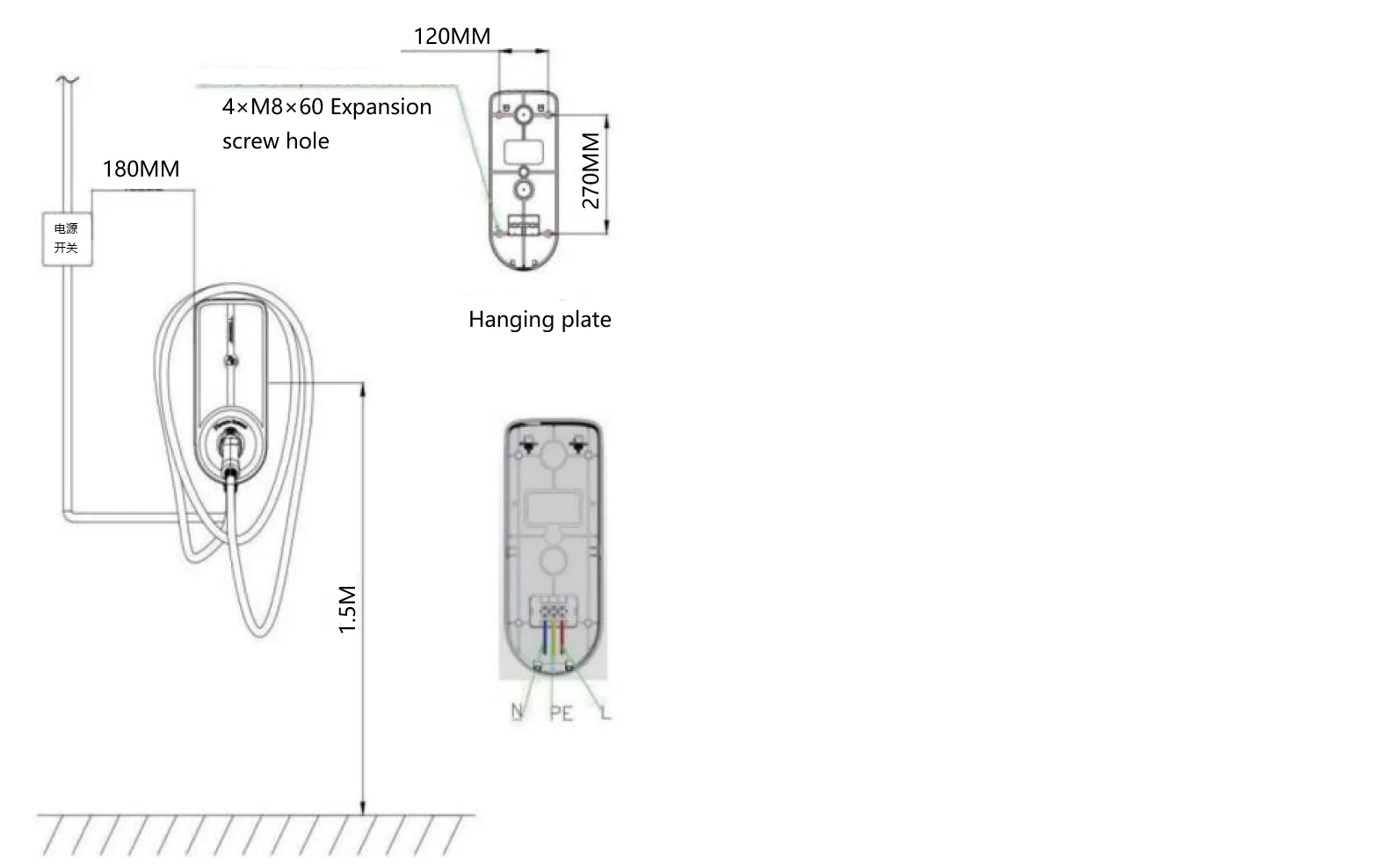 1) Karga-pilaren lurretik duen altueraren erreferentzia datuak (1,3-1,5 metro)2) Markatu horman atzeko plakan muntatzeko zuloaren posizioa atzeko plakan muntatzeko zuloaren posizioaren arabera.